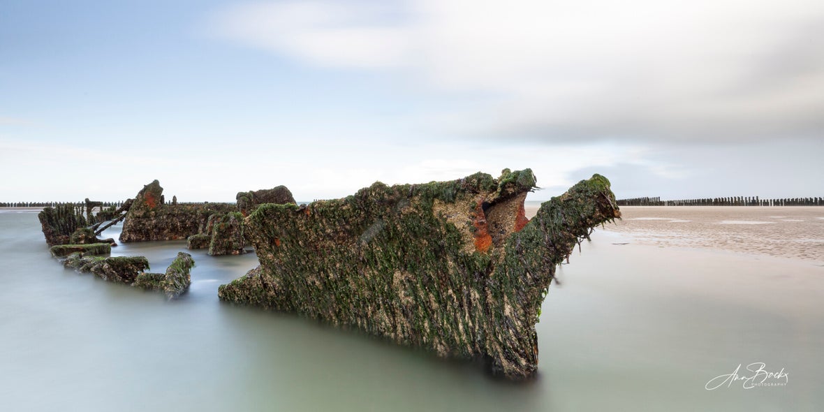 Vervolgens onthult Tardinghen haar schatten slechts bij laag tij. Een wrak dat is weggewassen door tijd en getijden toont zijn naakte glorie onder het zachte licht van de ondergaande zon; een eerbetoon aan vergankelijkheid te midden van zijn verval. Maar ook de mosselpaaltjes komen dan boven water, soms reeds geoogst, andere keren nog hoogzwanger.