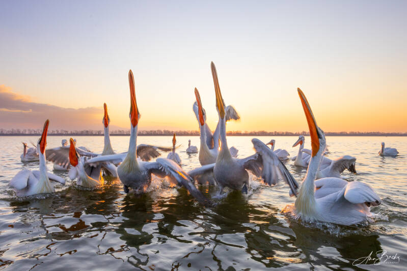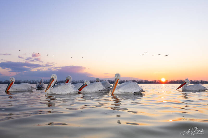 De zonsopgang brengt een symfonie van geluid, waarin deze immense dieren spreken met keelgeluiden die invulling geven aan de ochtendrust. Kroeskoppelikanen vleien zich neer aan de oevers, toegewijd aan hun siësta na urenlang voeden en verkennen.