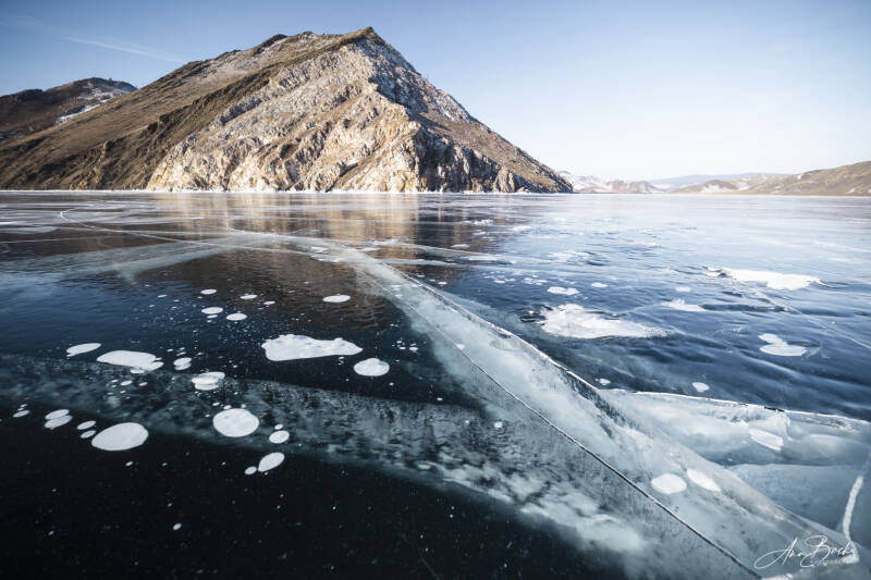 Het oppervlak van het meer is bedekt met een enorme ijslaag, continu krakend onder de druk van zijn eigen gewicht. Het gebroken ijs botst en vormt imposante toros, terwijl methaanbellen gevangen zitten in de bevriezende pracht - unieke abstracte kunstwerken door Moeder Natuur zelf gecreëerd.